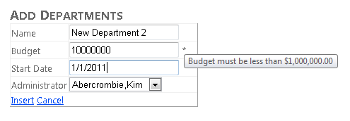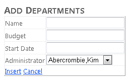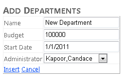 Questo markup crea due ObjectDataSource controlli, uno per l'inserimento di nuove Department entità e uno per il recupero dei nomi degli insegnanti per il DropDownList controllo usato per la selezione degli amministratori del reparto. Il markup crea un DetailsView controllo per l'immissione di nuovi reparti e specifica un gestore per l'evento del ItemInserting controllo, in modo che sia possibile impostare il valore della Administrator chiave esterna. Alla fine c'è un ValidationSummary controllo per visualizzare i messaggi di errore.