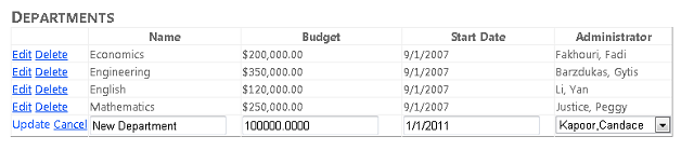 Il gestore per l'evento Init salva un riferimento al DropDownList controllo nel campo della classe. Il gestore per l'evento RowUpdating usa il riferimento per ottenere il valore immesso dall'utente e applicarlo alla Administrator proprietà dell'entità Department .