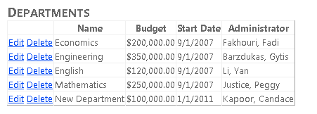 Le pagine create in questa esercitazione funzionano con il Departments set di entità del modello di dati creato nella serie di esercitazioni introduttive.