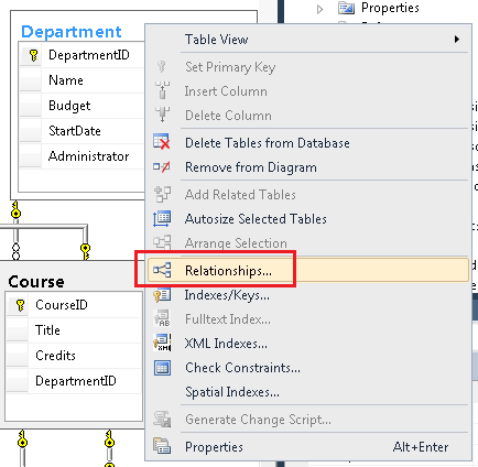 Nel diagramma di database fare clic con il pulsante destro del mouse sulla Department tabella e scegliere Relazioni.