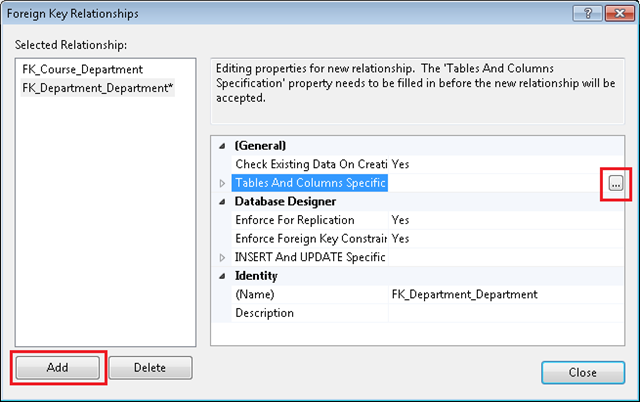 Nella casella Relazioni chiave esterna fare clic su Aggiungi, quindi fare clic sui puntini di sospensione per Specifica tabelle e colonne.