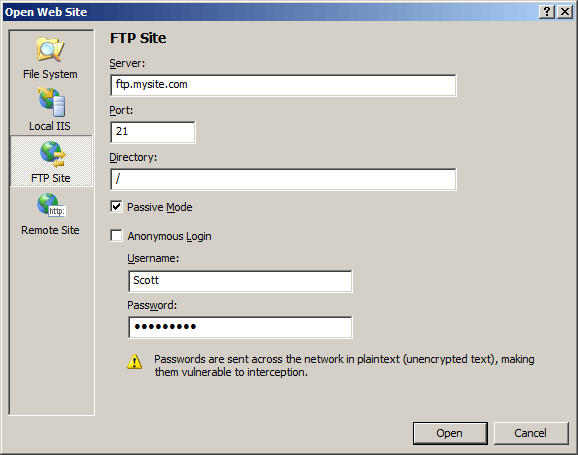Per distribuire il sito è necessario prima connettersi al provider host Web. Fare clic sul pulsante "Connetti" nella parte superiore dell'interfaccia utente di "Copia sito Web". Verrà visualizzata la finestra di dialogo Apri sito Web illustrata nella figura 2.
