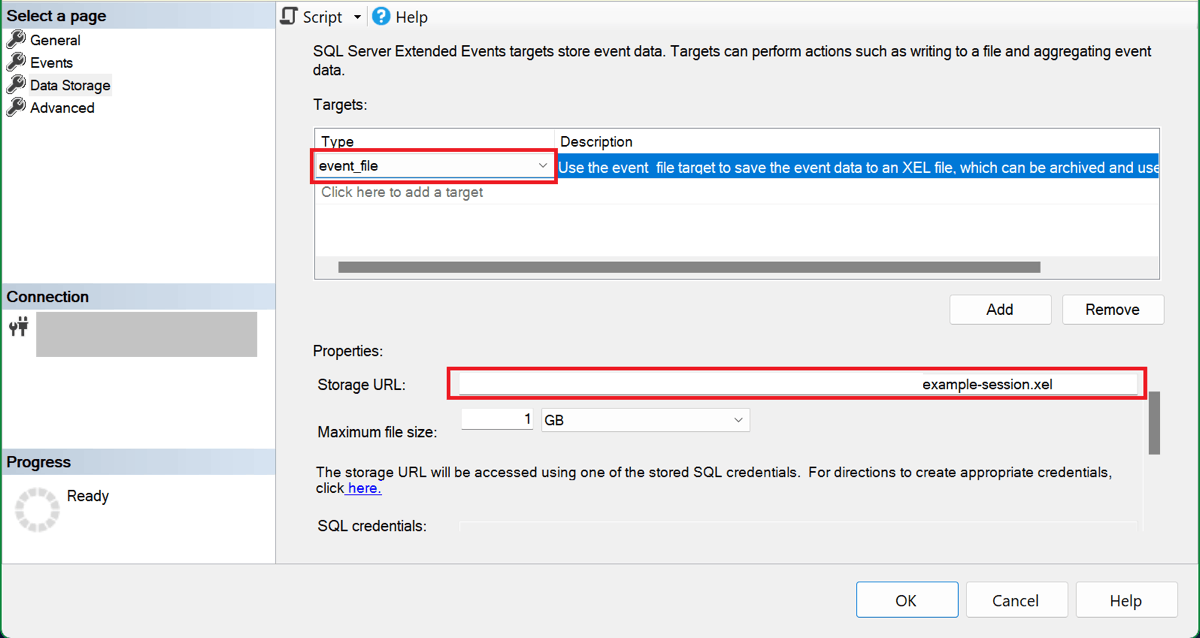 event_filecome tipo di destinazione e incollare l'URL del contenitore di archiviazione nella casella URL Archiviazione. Digitare una barra (/) alla fine di questo URL, seguita dal nome del file (BLOB). In questo esempio il nome del BLOB èexample-session.xele l'intero URL èhttps://<storage-account-name>.blob.core.windows.net/<container-name>/example-session.xel.Note