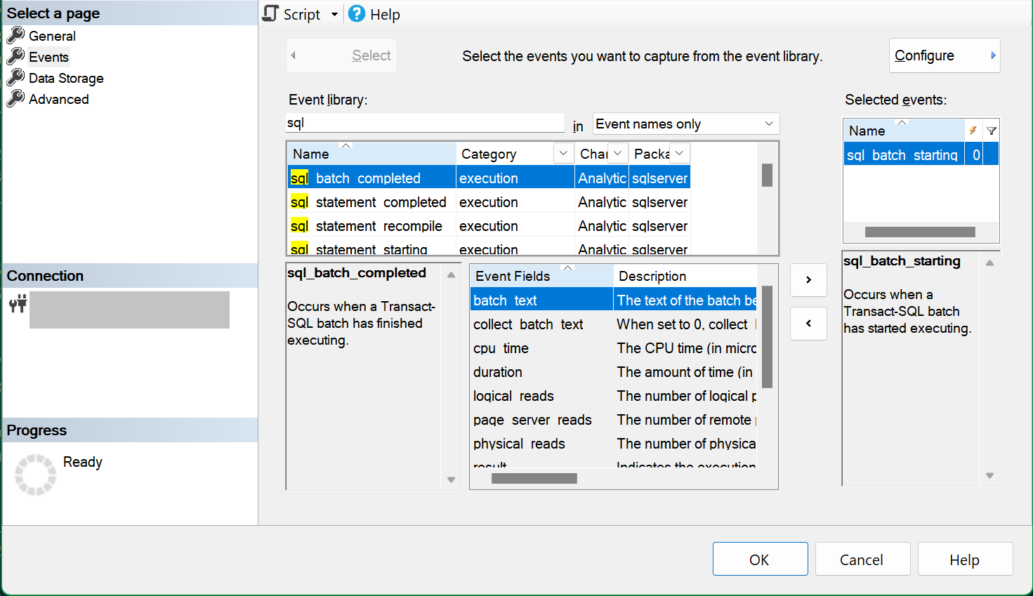 filename, simile all'esempio di Istanza gestita di SQL riportato di seguito ed eseguire lo script per creare la sessione.Dopo aver configurato la sessione, è possibile selezionare il pulsante Script per creare uno script T-SQL della sessione per salvarlo per un secondo momento. Ecco lo script per la sessione di esempio: