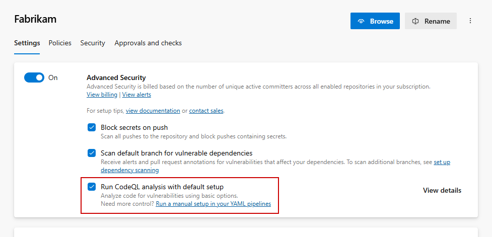 È consigliabile iniziare con l'installazione predefinita. Se è necessario un maggiore controllo sulla configurazione di analisi, ad esempio pool di agenti diversi, passaggi di compilazione personalizzati per i linguaggi compilati o l'analisi in più rami, è possibile eseguire sia la configurazione predefinita che la configurazione avanzata nella stessa organizzazione. Per altre informazioni, vedere Configurare l'analisi del codice.