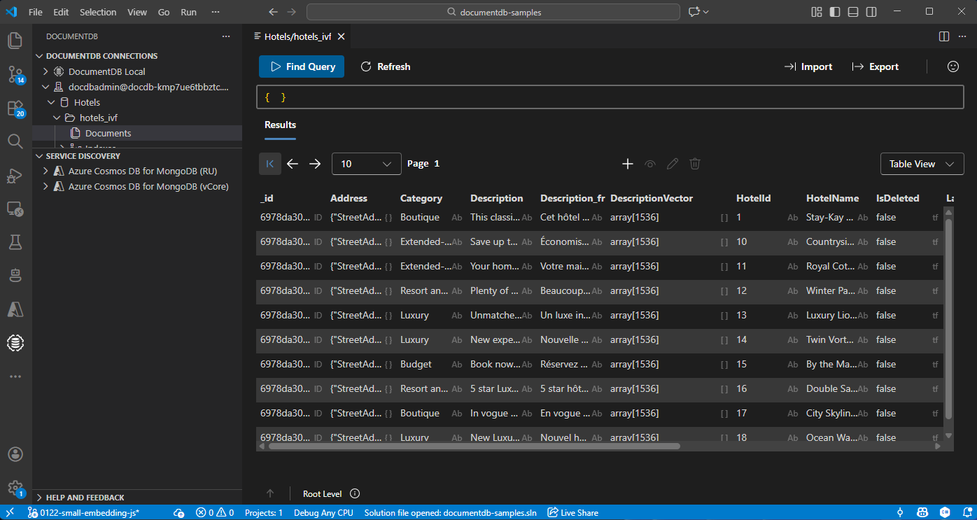 Questa guida introduttiva usa un set di dati di esempio di un hotel in un file JSON con vettori pre-calcolati dal modello text-embedding-3-small. Il set di dati include nomi di hotel, località, descrizioni e incorporamenti vettoriali.