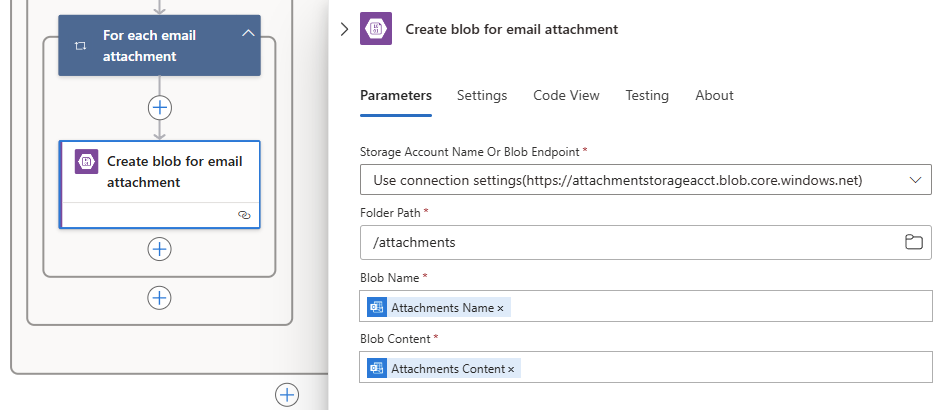 Aggiungere quindi un'azione che salva ogni allegato come BLOB nel contenitore di archiviazione degli allegati.