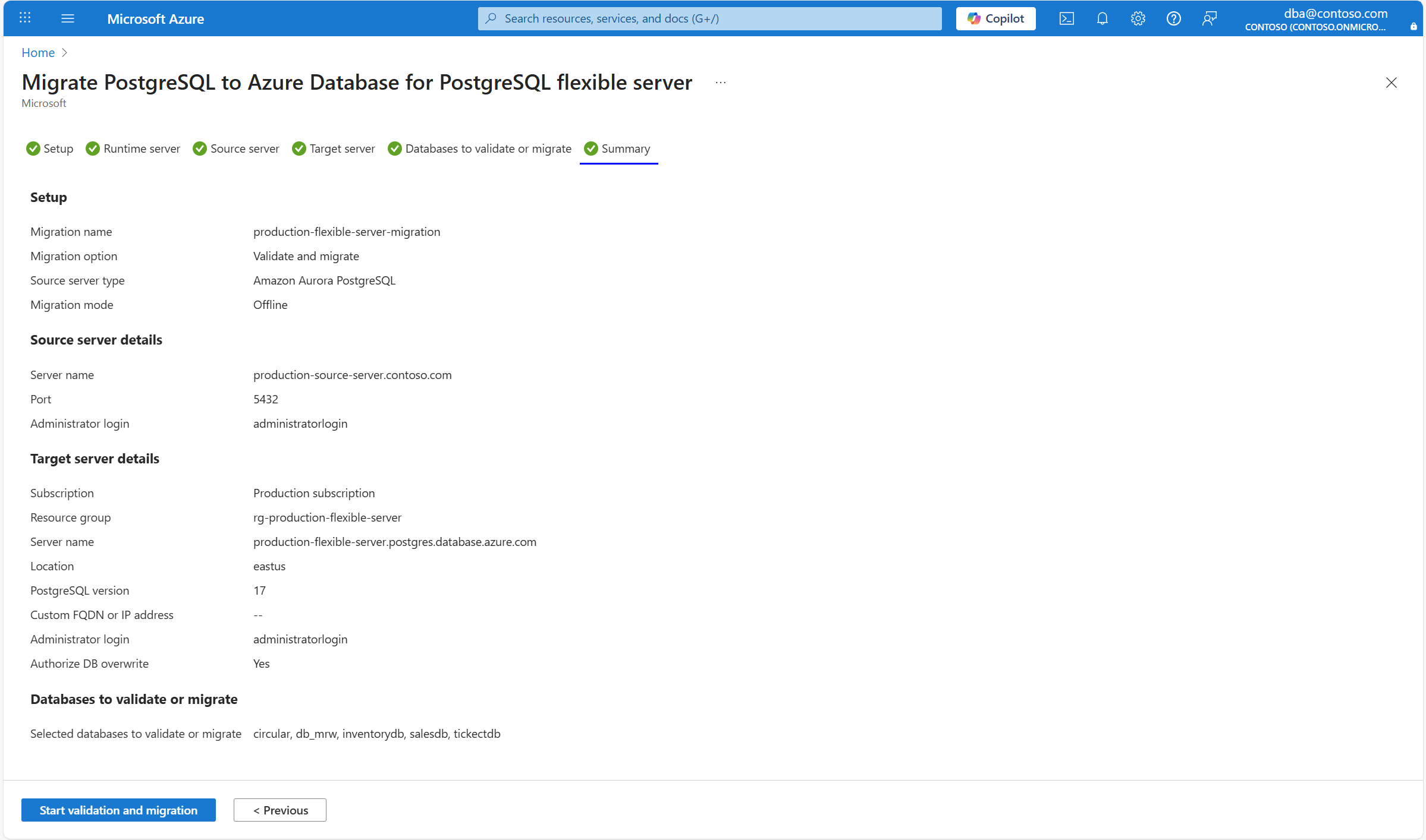 La scheda Riepilogo riepiloga tutti i dettagli di origine e destinazione per la creazione della convalida o della migrazione. Esaminare i dettagli e selezionare Avvia convalida e migrazione.