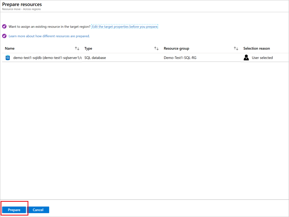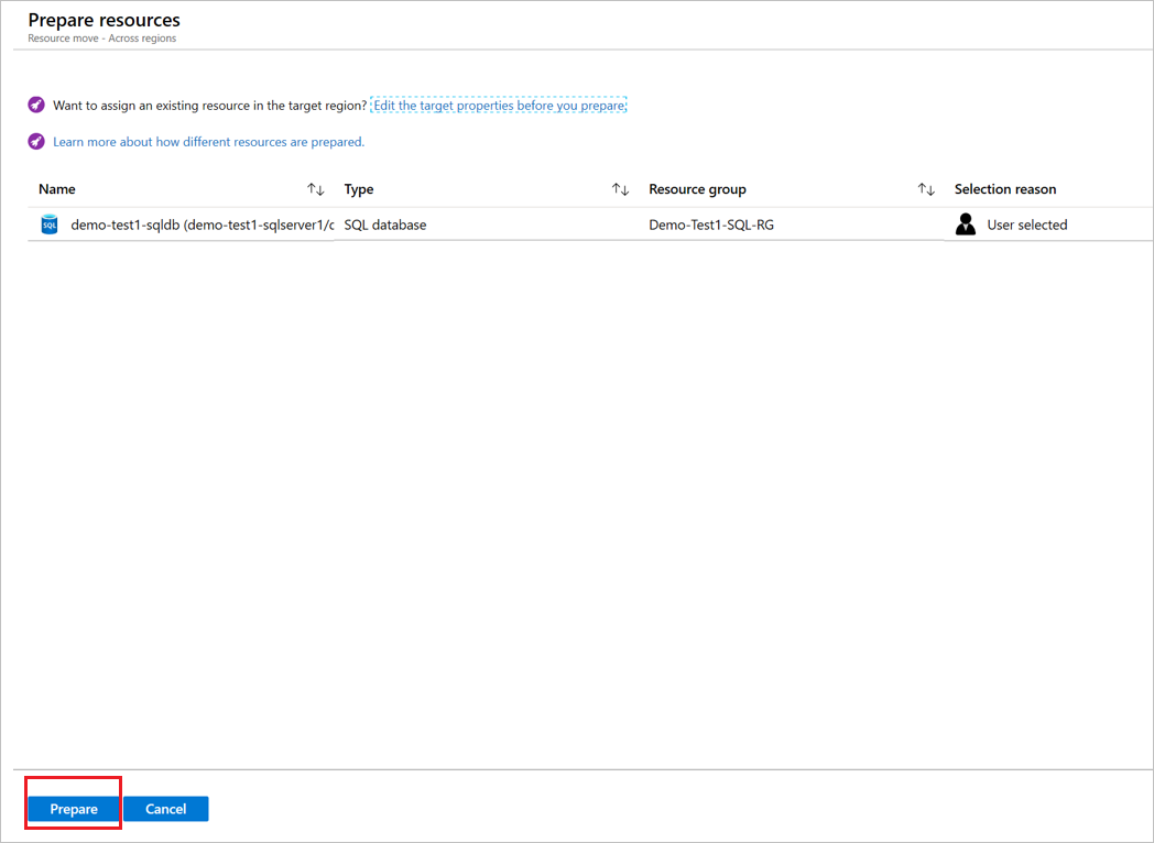 1. In Tra aree selezionare il database (demo-test2-sqldb nella procedura dettagliata) e quindi selezionare Prepara.