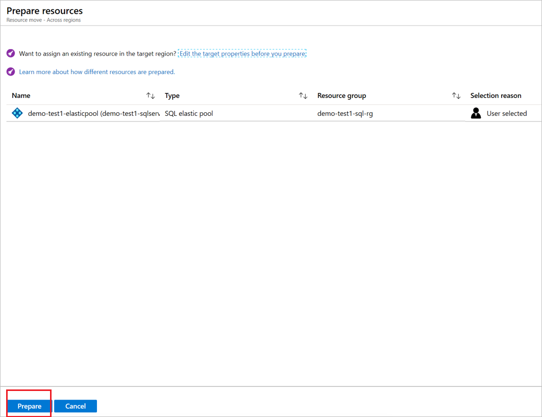 1. In Tra aree selezionare il pool elastico di origine (demo-test1-elasticpool nella procedura dettagliata) e selezionare Prepara.