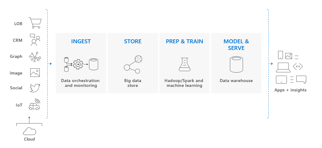 In una soluzione per i dati cloud, i dati vengono inseriti in archivi di Big Data da diverse origini. Una volta posizionati in un archivio di big data, Hadoop, Spark e gli algoritmi di machine learning preparano e addestrano i dati. Quando i dati sono pronti per essere sottoposti ad analisi complesse, il pool SQL dedicato usa PolyBase per eseguire query sugli archivi di Big Data. PolyBase usa query T-SQL standard per inserire i dati in tabelle del pool SQL dedicato (in precedenza SQL Data Warehouse).