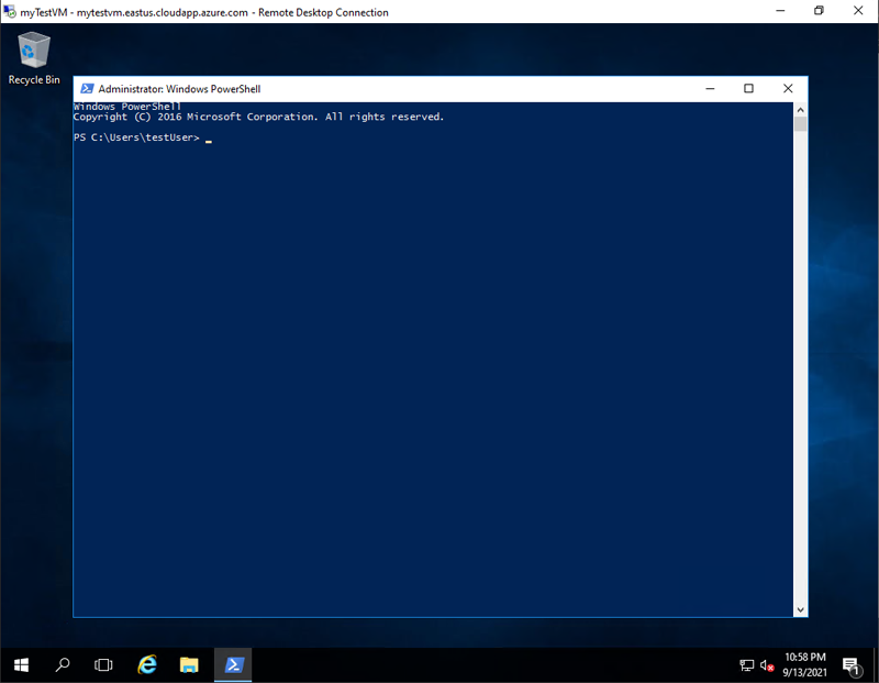 Dopo aver stabilito una connessione RDP alla macchina virtuale remota, selezionare il menu Start di Windows. Immettere PowerShell nella casella di ricerca e selezionare Windows PowerShell per aprire una finestra di PowerShell.