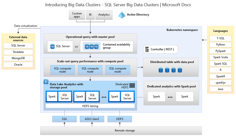 In SQL Server 2019 (15.x), i cluster Big Data di SQL Server consentono di distribuire cluster scalabili di contenitori SQL Server, Spark e HDFS in esecuzione in Kubernetes. Questi componenti vengono eseguiti in modo affiancato per permettere la lettura, la scrittura e l'elaborazione di Big Data da Transact-SQL o Spark, in modo da combinare e analizzare facilmente i dati relazionali di alto valore con volumi elevati di Big Data.