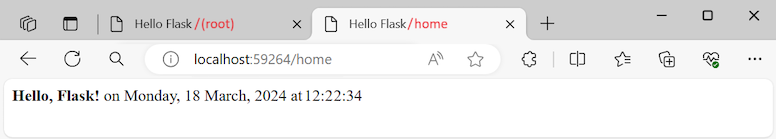 from datetime import datetime from flask import render_template from HelloFlask import app @app.route('/') @app.route('/home') def home(): now = datetime.now() formatted_now = now.strftime("%A, %d %B, %Y at %X") html_content = "<html><head><title>Hello Flask</title></head><body>" html_content += "<strong>Hello Flask!</strong> on " + formatted_now html_content += "</body></html>" return html_contentSave your changes and run your app again.