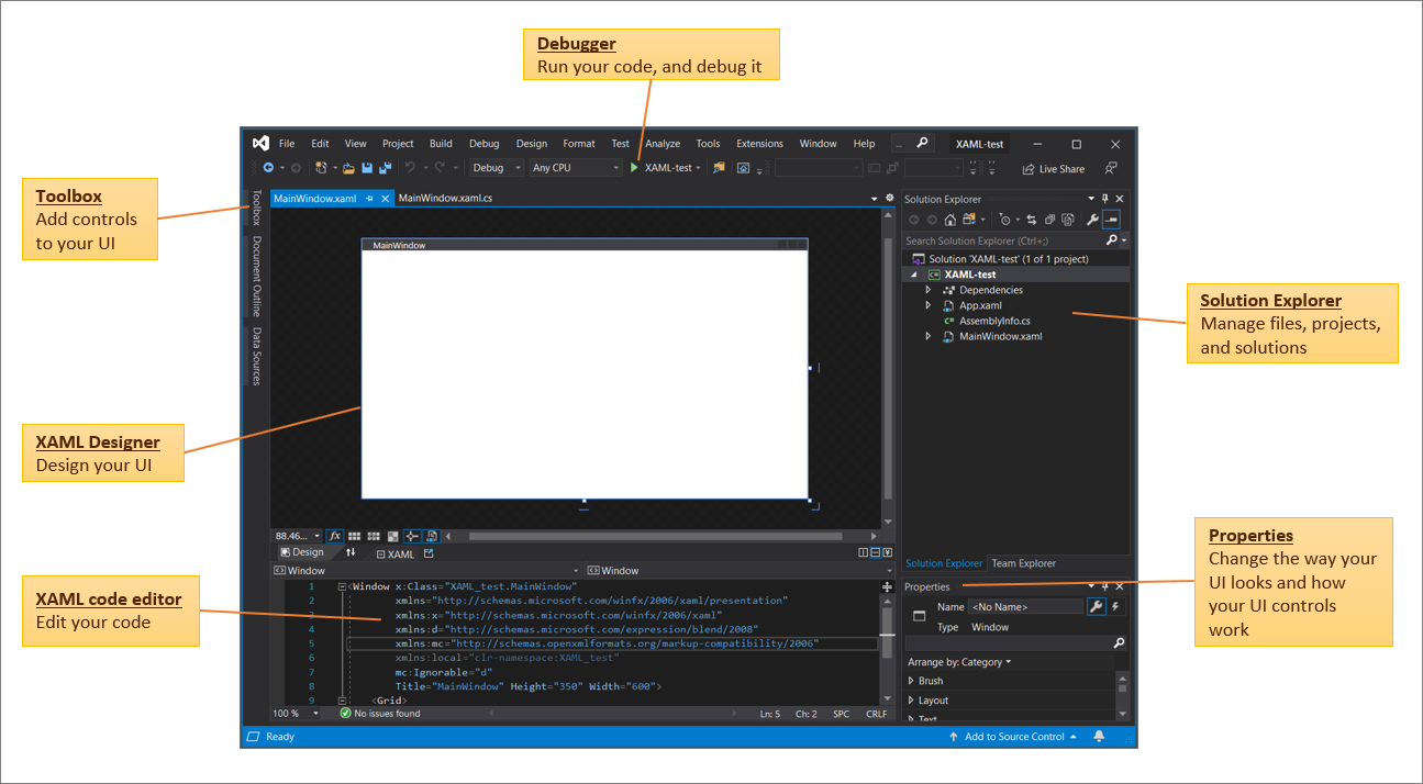 The XAML code editor in the Visual Studio IDE includes all the tools you need to create WPF and UWP apps for the Windows platform, and for Xamarin.Forms or .NET MAUI. This article outlines both the role the code editor plays when you develop XAML-based apps, and the features that are unique to the XAML code editor in Visual Studio 2019.