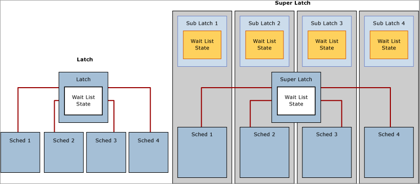 Con la crescente presenza di sistemi multiple socket/multi-core basati su NUMA, SQL Server 2005 ha introdotto Superlatches, note anche come sottolaghe, che sono efficaci solo nei sistemi con 32 o più processori logici. Superlatches migliorano l'efficienza del motore SQL per alcuni modelli di utilizzo in ambienti OLTP altamente concorrenti; ad esempio, quando alcune pagine presentano un modello di accesso condiviso prevalentemente in sola lettura (SH), ma vengono aggiornate raramente. Un esempio di pagina con un modello di accesso di questo tipo è una pagina radice dell'albero B (ovvero indice); Il motore SQL richiede che nella pagina radice venga mantenuto un latch condiviso quando si verifica una suddivisione di pagine a qualsiasi livello nell'albero B. In un carico di lavoro OLTP con molti inserimenti e concorrenza elevata, il numero di suddivisioni di pagine aumenta in modo proporzionale al flusso, il che può degradare le prestazioni. Le superlatches possono consentire un aumento delle prestazioni per l'accesso alle pagine condivise in cui più thread di lavoro in esecuzione simultanea richiedono SH latch. A tale scopo, il motore di SQL Server promuove dinamicamente un latch in una pagina di questo tipo in un superlatch. Un superlatch suddivide un singolo latch in una matrice di strutture di sublatch, una partizione per ogni core CPU, in cui il latch principale diventa un proxy di reindirizzamento e la sincronizzazione dello stato globale non è necessaria per i latch di sola lettura. In questo modo, il lavoratore, che viene sempre assegnato a una CPU specifica, deve solo acquisire il sottolatch condiviso (SH) assegnato allo scheduler locale.