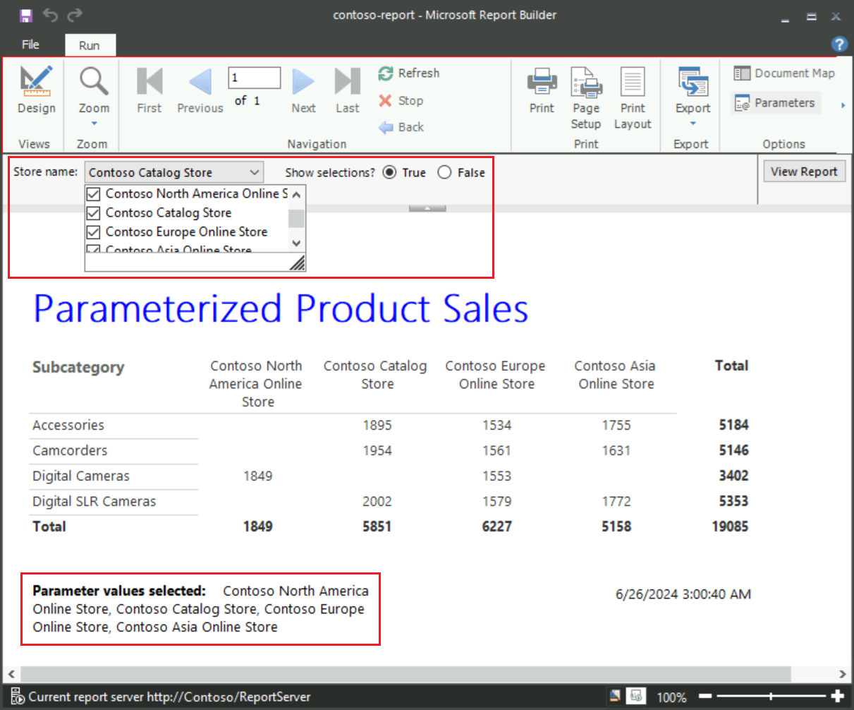 6. Nella barra degli strumenti del Report viewer, per la richiesta Nome punto vendita, selezionare Contoso Asia Online Store, e quindi scegliere Visualizza report.