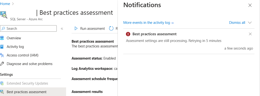 PATCHall'API per aggiornare l’estensione Azure per le impostazioni della valutazione di SQL Server.PATCH https://management.azure.com/subscriptions/ <subscription-id>/resourceGroups/<resource-group-name>/providers/Microsoft.HybridCompute/machines/<arc-resource-name>/extensions/WindowsAgent.SqlServer?api-version=2022-08-11-previewPassa a Valutazione delle procedure consigliate nella pagina risorsa di SQL Server abilitata per Arc in portale di Azure, abilita nuovamente la valutazione delle procedure consigliate e seleziona una nuova area di lavoro Log Analytics.