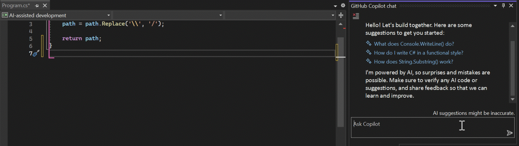 GitHub Copilot nell'IDE di Visual Studio funge da programmatore di coppie di intelligenza artificiale che consentono di essere più produttivi ed efficienti durante la scrittura di codice. È necessario Visual Studio 2022 versione 17.8 o successiva per usare Copilot in Visual Studio.