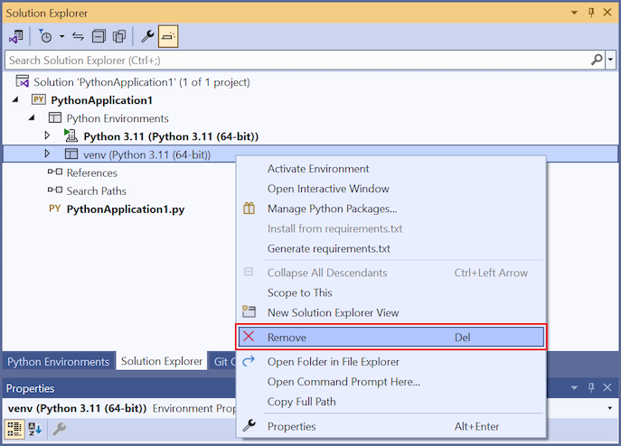 Per rimuovere un progetto Python, passare all'ambiente Python in Esplora soluzioni. Fare clic con il pulsante destro del mouse sull'ambiente Python da rimuovere e scegliere Rimuovi.