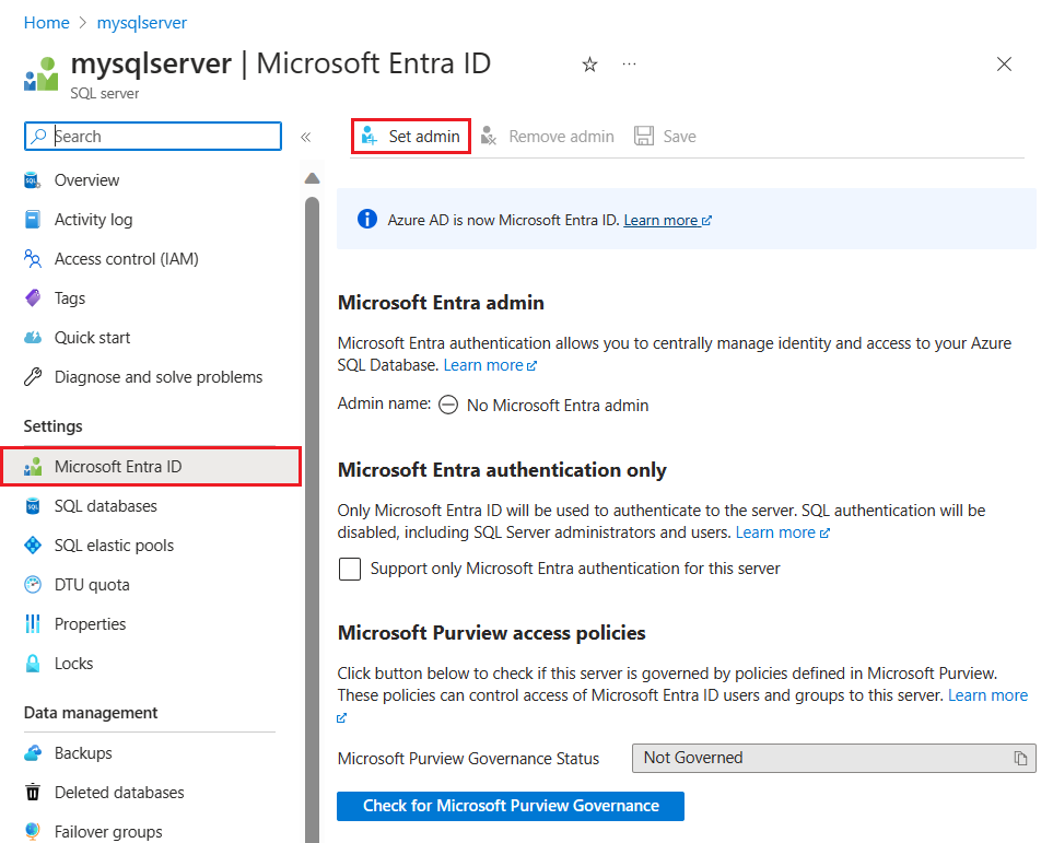 Microsoft Entra 관리자를 설정하려면 다음을 수행합니다.
