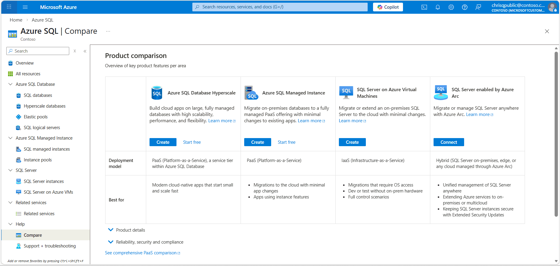 SQL Database와 SQL Server 및 Azure SQL Managed Instance 간의 기능 차이점과 다양한 Azure SQL Database 옵션 간의 차이점을 파악하려면 SQL Database 기능을 참조하세요.