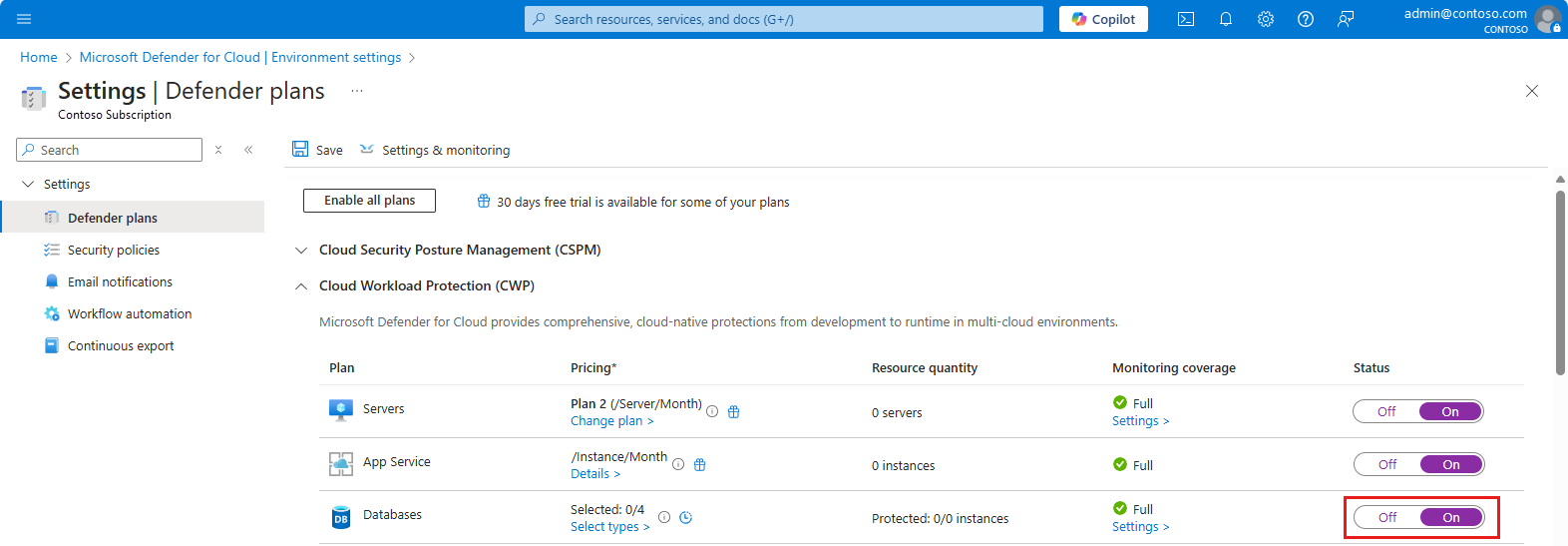 Defender 플랜 페이지에서 데이터베이스 플랜을 켜기로 전환합니다.