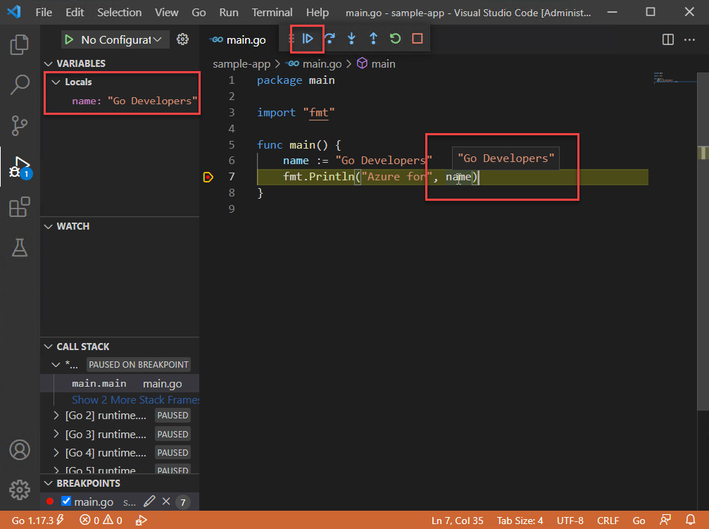 이 빠른 시작에서는 Go 컴파일러 및 도구를 설치하고, Visual Studio Code를 설치하여 Go 코드를 작성하고, Go를 작성하는 동안 지원을 제공하는 Visual Studio Code용 Go 확장을 설치합니다. 구성되면 애플리케이션을 만들고 실행하고 디버깅 도구를 사용하여 실행을 일시 중지하고 변수 값을 관찰합니다.