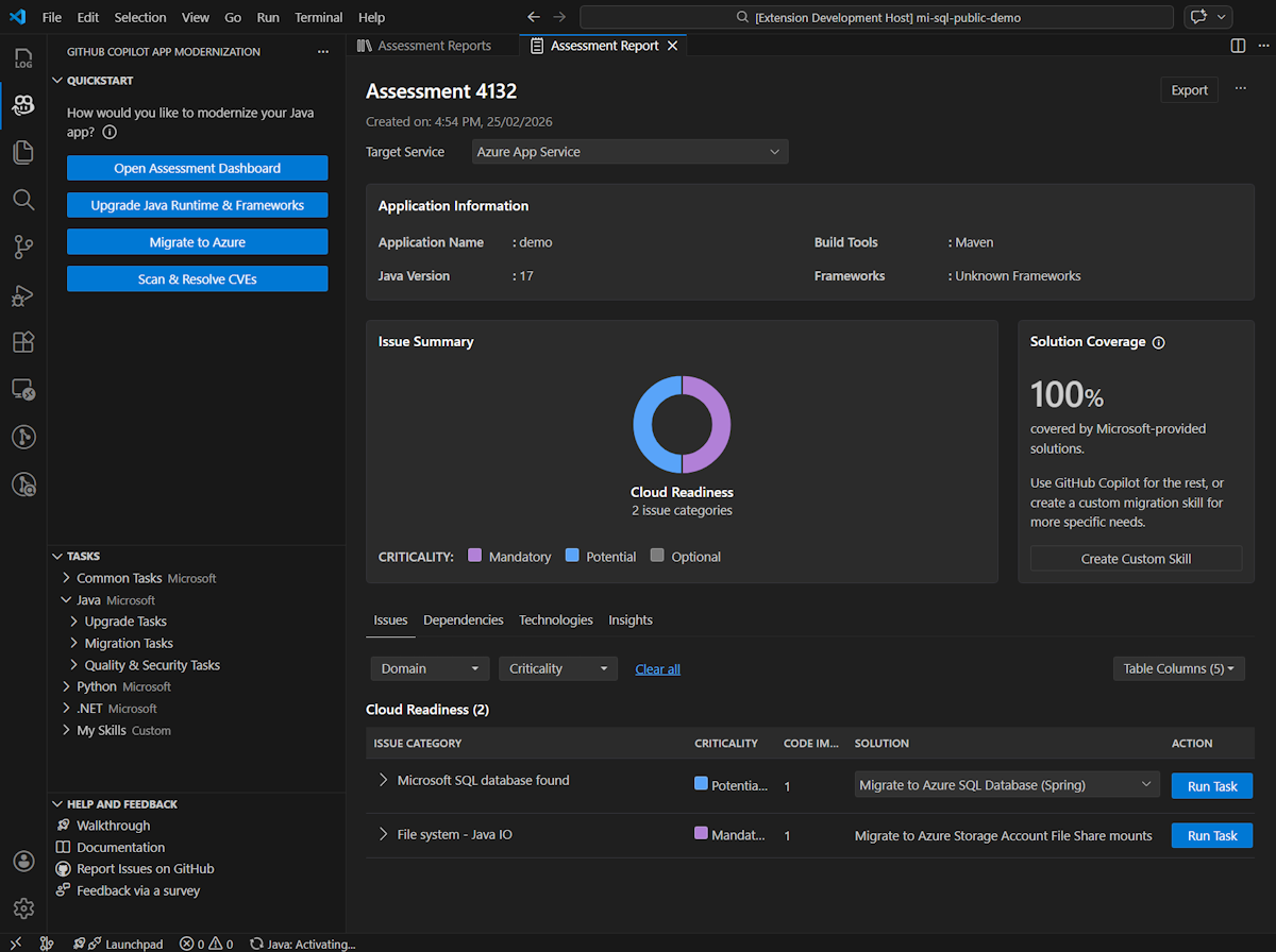 이 빠른 시작에서는 GitHub Copilot 현대화를 사용하여 Java 프로젝트를 평가하고 마이그레이션하는 방법을 보여줍니다. 이 빠른 시작에서는 확장을 설치 및 구성한 다음 샘플 프로젝트를 평가하고 마이그레이션합니다. 예를 들어 미리 정의된 작업을 사용하여 사용자 이름과 암호 대신 Azure 관리 ID를 사용하도록 Azure SQL 데이터베이스 연결을 업데이트합니다.