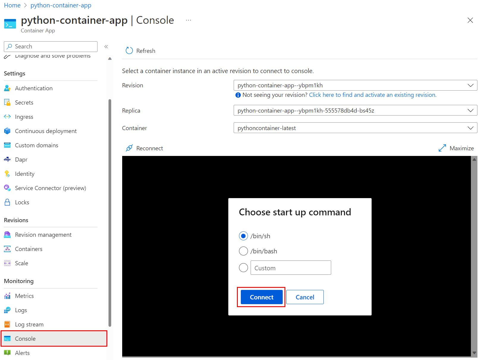 az containerapp exec \ --name $CONTAINER_APP_NAME \ --resource-group $RESOURCE_GROUP_NAME그런 다음 셸 명령 프롬프트에서