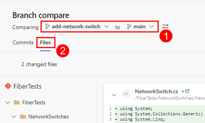 2. 분기 비교 보기에서 비교할 두 분기를 선택합니다. 변경된 각 파일에서 새 줄, 삭제됨 또는 수정된 줄의 차이 보기에 대한 파일 탭을 선택합니다.
