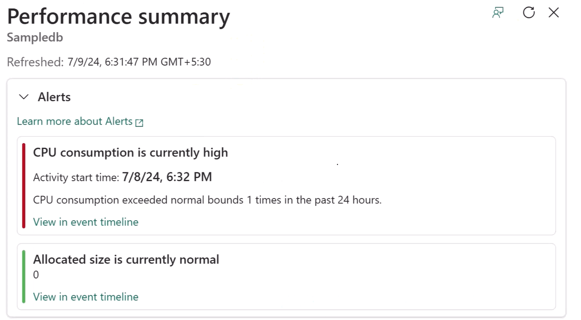 경고 에 대한 링크를 선택하면 성능 요약 에서 경고 및 데이터베이스의 최근 메트릭에 대한 요약을 제공합니다. 여기에서 이벤트 타임라인을 자세히 살펴볼 수 있습니다.