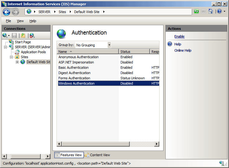 IIS 7 이상의 기본 설치에는 Windows 인증 역할 서비스가 포함되지 않습니다. IIS에서 Windows 인증 사용하려면 역할 서비스를 설치하고 웹 사이트 또는 애플리케이션에 대해 익명 인증을 사용하지 않도록 설정한 다음 사이트 또는 애플리케이션에 Windows 인증 사용하도록 설정해야 합니다.