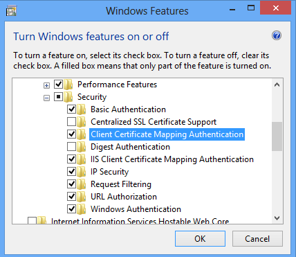 서버 역할 페이지에서 웹 서버(IIS)를 확장하고 웹 서버를 확장하고 보안을 확장한 다음 클라이언트 인증서 매핑 인증을 선택합니다.