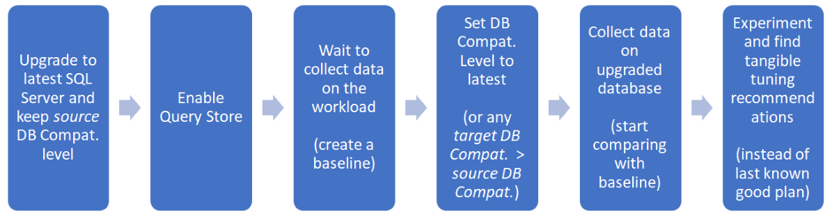 데이터베이스 호환성 수준에서 제공하는 이 게이팅 기능은 쿼리 저장소와 함께 업그레이드가 다음 다이어그램에 표시된 권장 워크플로를 따르는 경우 업그레이드 프로세스에서 쿼리 성능을 매우 잘 제어할 수 있습니다. 호환성 수준을 업그레이드하는 데 권장되는 워크플로에 대한 자세한 내용은 데이터베이스 호환성 수준 변경 및 쿼리 저장소 사용을 참조하세요.