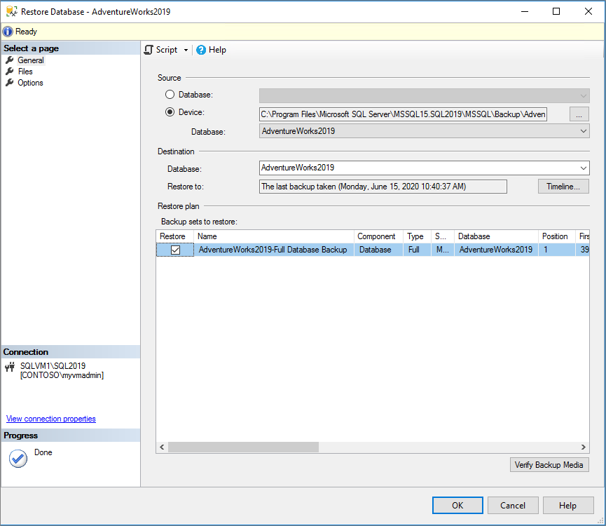 파일 탭을 선택하여 복원 위치 및 파일 이름이 데이터베이스 복원 마법사에서 설정한 의도한 위치 및 파일 이름과 일치하는지 확인합니다.