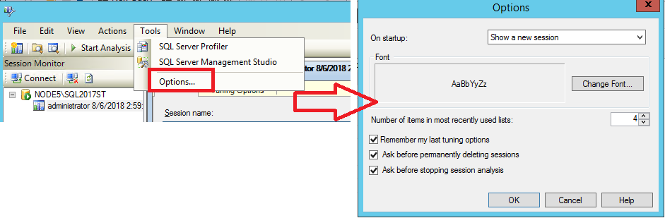시작 목록을 확장하여 시작할 때 데이터베이스 엔진 튜닝 관리자가 표시할 수 있는 내용을 확인합니다. 기본적으로 새 세션 표시가 선택되어 있습니다.
