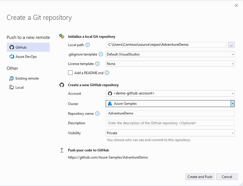 Git 리포지토리 만들기 대화 상자의 새 원격으로 푸시 섹션에서 GitHub를 선택합니다.