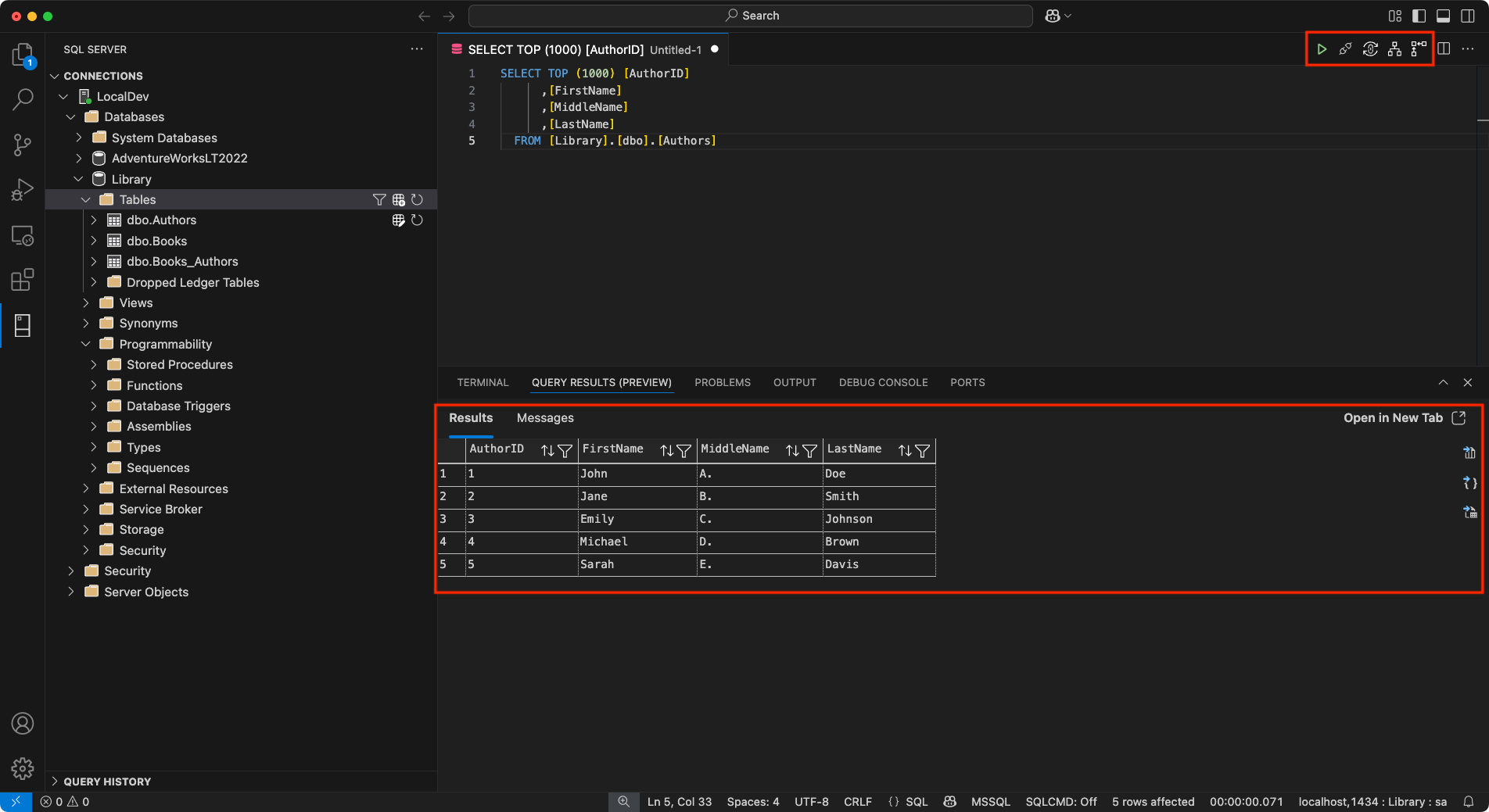 쿼리 결과는 통합 터미널, 출력, 디버그 콘솔 및 기타 도구와 함께 Visual Studio Code의 아래쪽 패널 내에 표시됩니다.