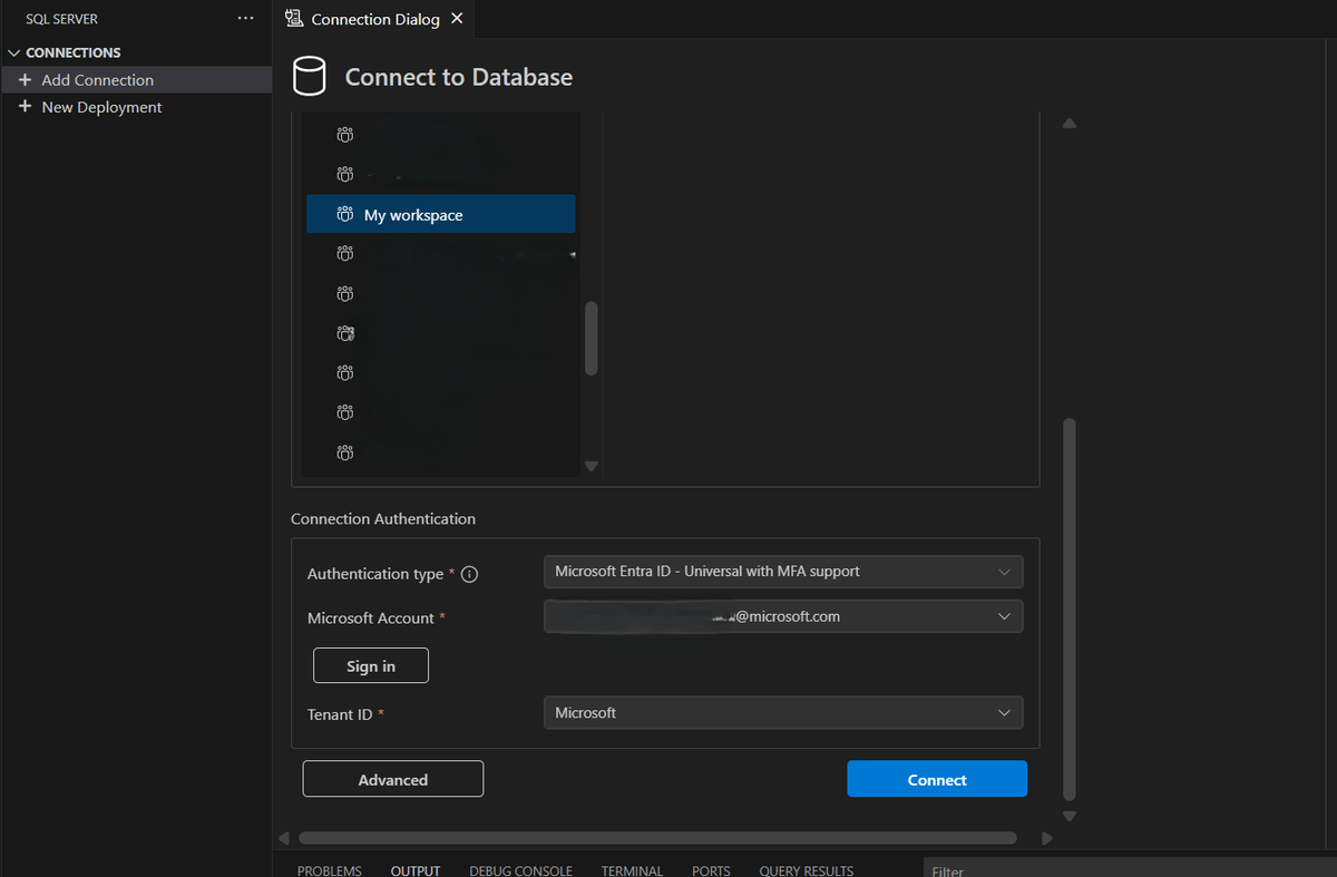 Visual Studio Code용 MSSQL 확장은 Microsoft Fabric의 SQL 데이터베이스에 대한 연결을 지원합니다. 연결 대화 상자에는 Microsoft Entra ID를 사용하여 로그인하는 데 사용하는 패브릭 연결 옵션이 포함되어 있습니다. 수동으로 연결 문자열을 구성하지 않고도 트리 보기에서 패브릭 작업 영역을 찾아보고, 작업 영역을 검색하고, SQL 데이터베이스 또는 엔드포인트에 연결할 수 있습니다. 확장은 패브릭 확장에서 영구 로그인, 테넌트 전환 및 MSSQL에서 원활한 열기 흐름을 지원합니다.