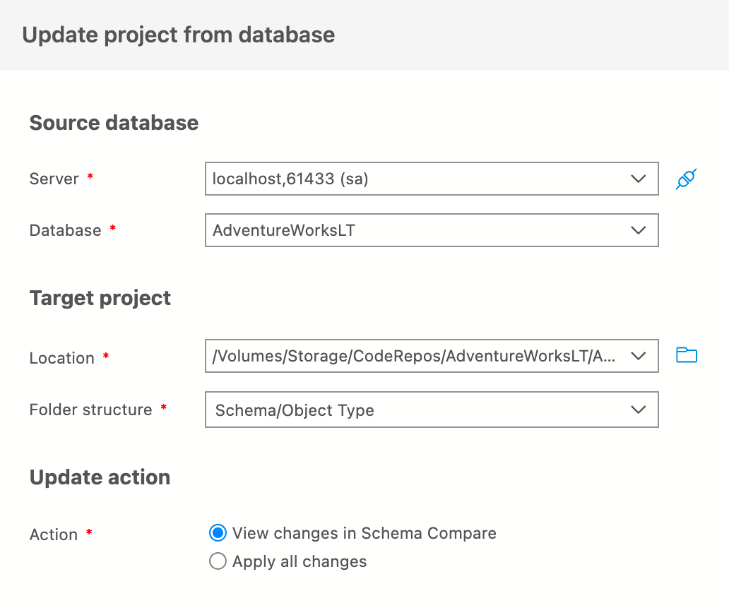 SQL 프로젝트를 변경하지 않은 데이터베이스를 변경하는 경우 데이터베이스 상태에서 SQL 프로젝트를 업데이트할 수 있습니다. 프로젝트를 업데이트하려면 연결 보기의 데이터베이스 상황에 맞는 메뉴 또는 데이터베이스 프로젝트 보기에 있는 SQL 프로젝트의 상황에 맞는 메뉴에서 데이터베이스에서 프로젝트 업데이트를 선택합니다. 데이터베이스의 변경 내용으로 SQL 프로젝트를 최신 상태로 유지하는 것은 데이터베이스 변경에 대한 소스 제어의 한 가지 방법입니다.