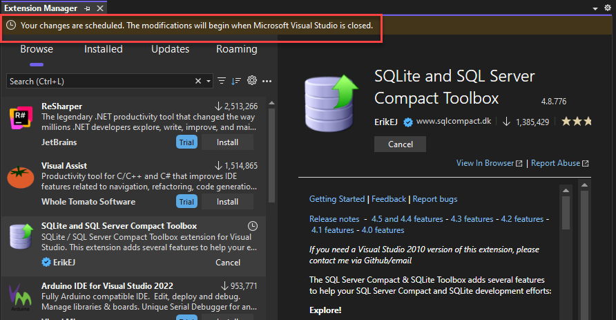 또한 업데이트가 적용되면 알림이 나타나며, 확장이 적용되도록 Visual Studio를 다시 시작하라는 알림이 표시됩니다.