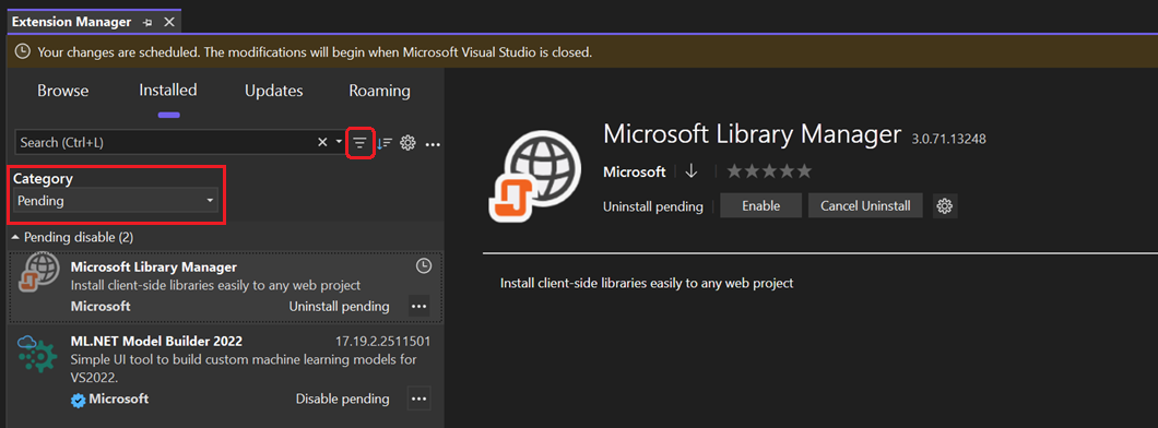 필터 단추를 사용하여 범주별로 확장을 필터링할 수 있습니다. 설치된 확장의 범주에는 사용, 사용 안 함 및 호환되지 않는 항목이 포함됩니다. 17.14 이상 버전에서는 다음에 Visual Studio를 다시 시작할 때 적용될 업데이트가 있는 확장 프로그램을 보류 항목으로 필터링할 수 있습니다.