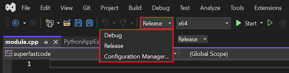 - C++ 프로젝트(superfastcode 또는 superfastcode2)의 경우 Python 설치와 일치하도록 대상 구성을 변경합니다. 예를 들어 C++ 프로젝트 대상 구성이 Win32이지만 Python 설치가 64비트인 경우 C++ 프로젝트 대상 구성을 x64로 변경합니다.