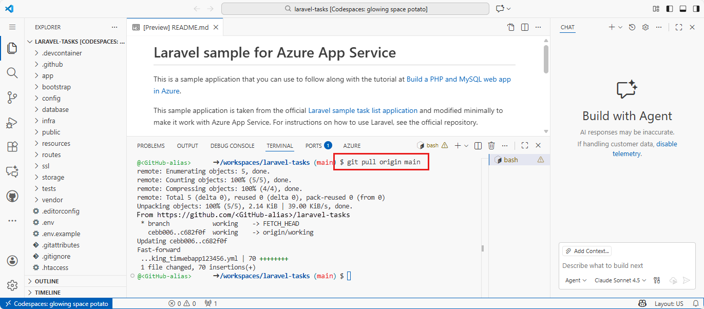 Vanuit de Stappen in Azure Portal in Laravel-variabelen configureren kunt u overschakelen APP_KEY naar een Key Vault-verwijzing door de volgende Azure CLI-opdrachten uit te voeren in de GitHub-coderuimte: