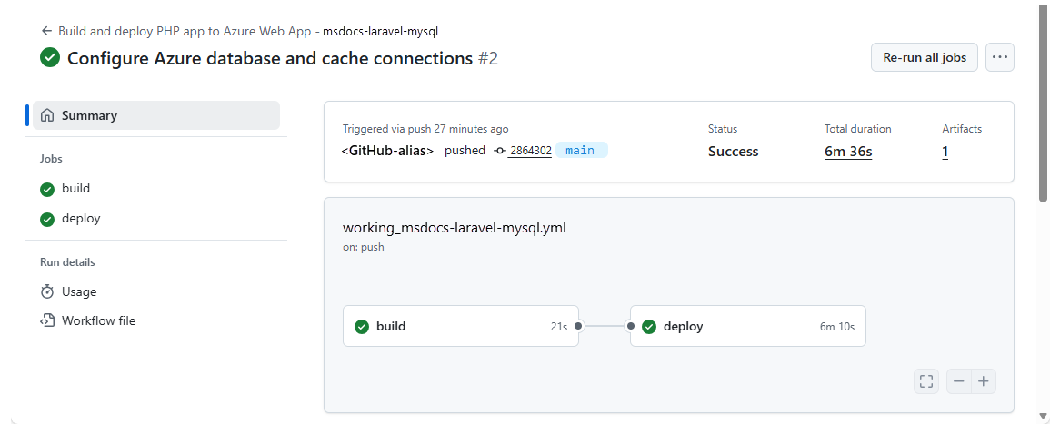 Het automatisch gegenereerde werkstroombestand van App Service definieert het bouwen-en-vervolgens-uitrollen, een run met twee taken. Omdat elke taak wordt uitgevoerd in een eigen schone omgeving, zorgt het werkstroombestand ervoor dat de deploy taak toegang heeft tot de bestanden vanuit de build taak: