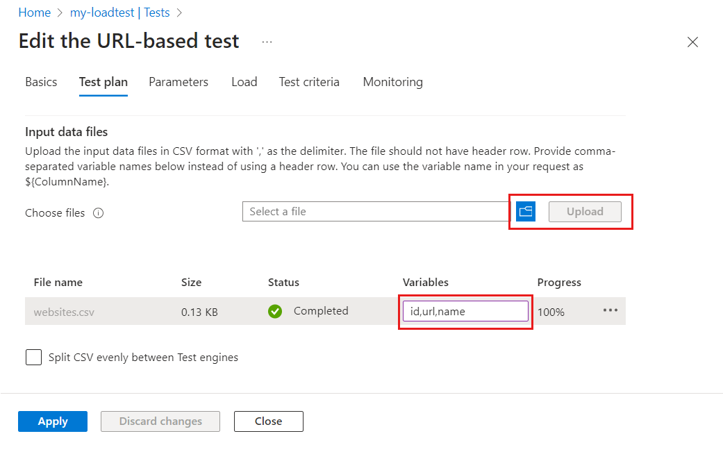 Azure Load Testing kopieert en verwerkt standaard uw invoerbestanden die niet zijn gewijzigd in alle exemplaren van de testengine. Standaard verwerkt elke testengine het hele CSV-bestand. Als alternatief kunt u met Azure Load Testing de CSV-invoergegevens gelijkmatig verdelen over alle engine-exemplaren. Als u meerdere CSV-bestanden hebt, wordt elk bestand gelijkmatig gesplitst.