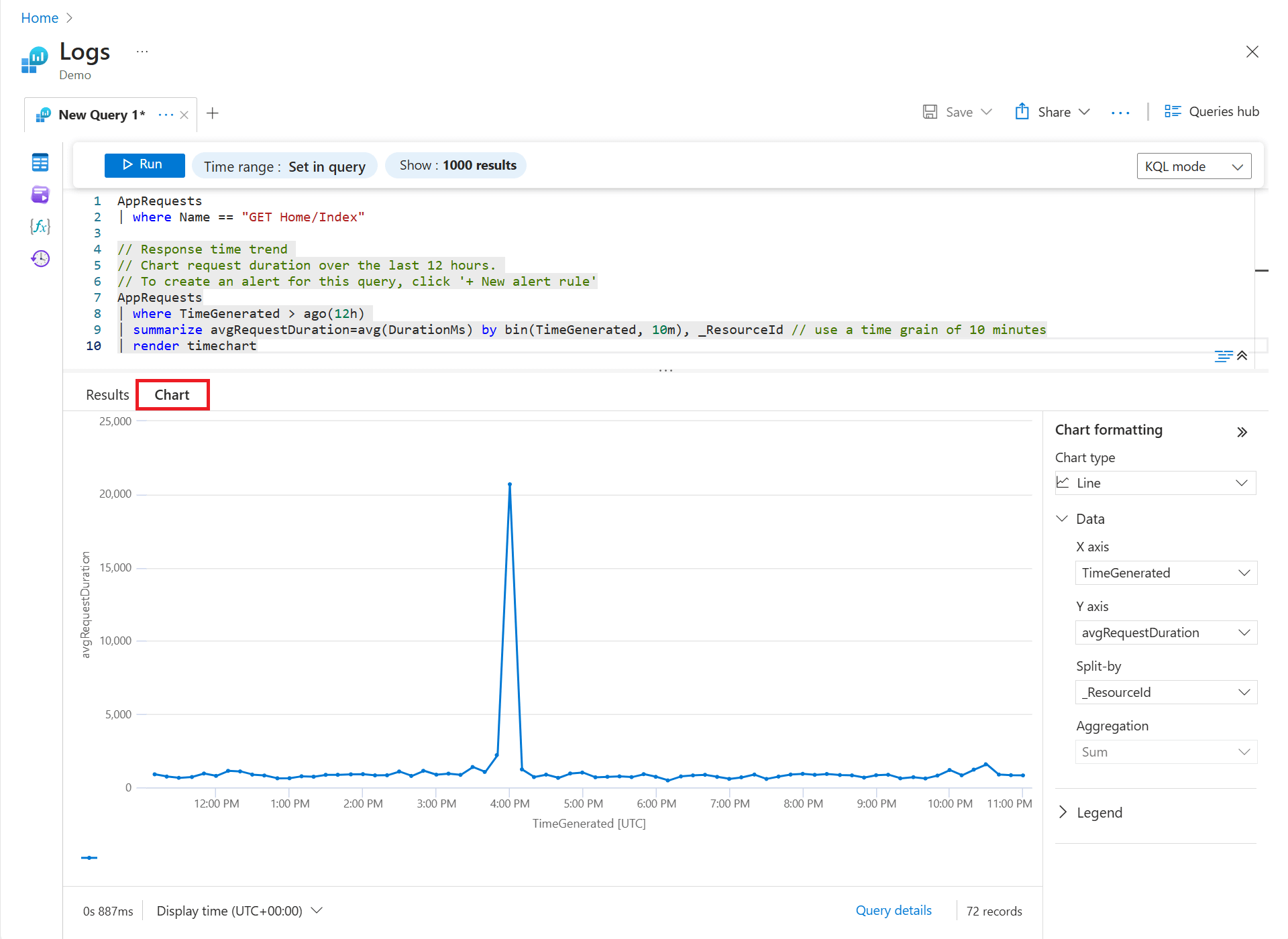 In dit voorbeeld zien we de duur van de aanvraag pieken om 16:00 uur. Als u een melding wilt ontvangen wanneer dergelijke pieken optreden, kunt u een waarschuwingsregel maken door het contextmenu (...) in de actiebalk te openen en + Nieuwe waarschuwingsregel te selecteren. Zie voor meer informatie Zelfstudie: Een logboekzoekwaarschuwing maken voor een Azure-resource.