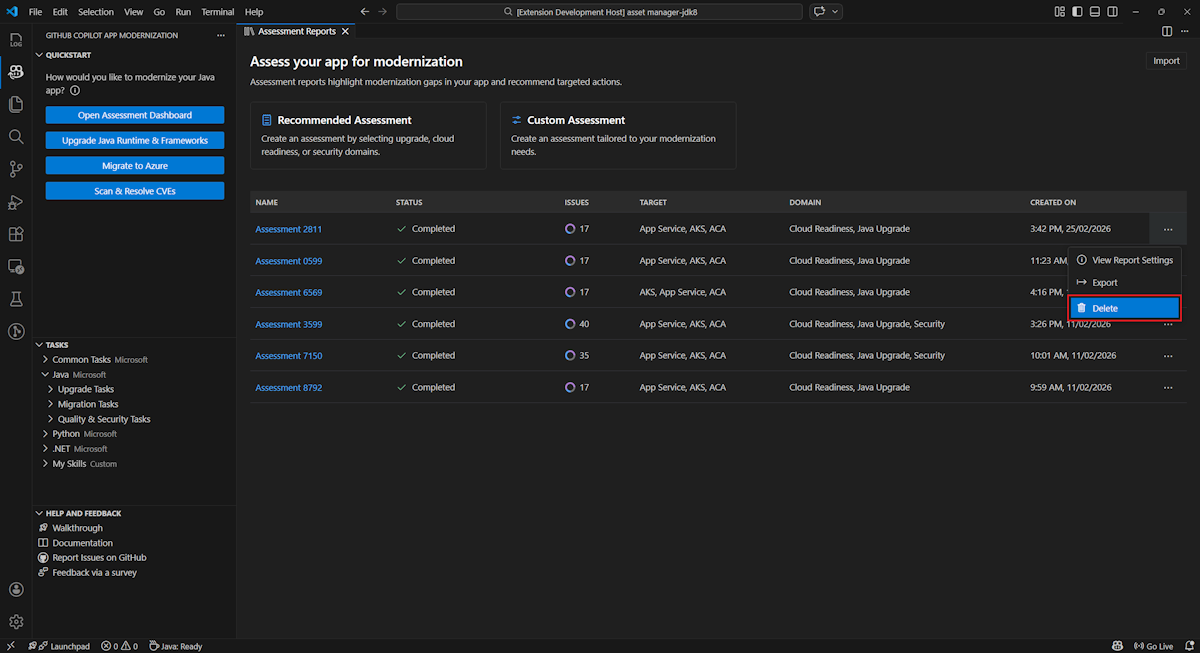 Naast het rechtstreeks uitvoeren van de evaluatie in GitHub Copilot-modernisering, kunt u ook evaluatierapporten importeren. De rapporten kunnen afkomstig zijn van AppCAT CLI-resultaten, zoals report.jsoneen geëxporteerd GitHub Copilot-rapport of een app-contextbestand van Dr. Migrate.