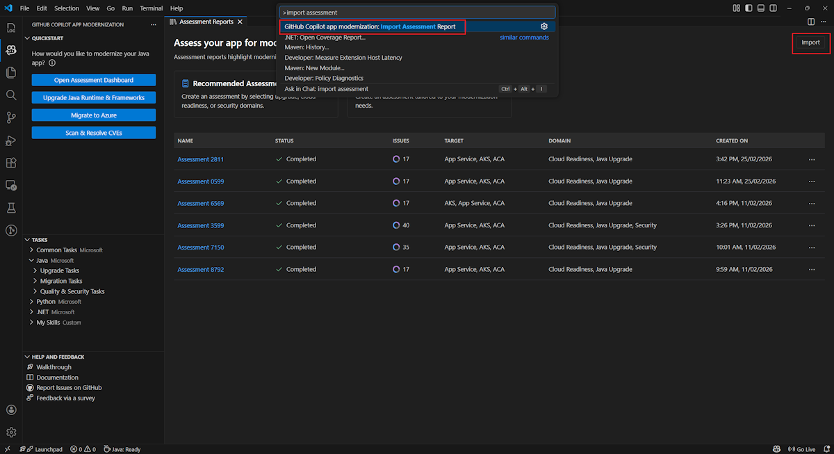 Als u een evaluatierapport wilt importeren in De modernisering van GitHub Copilot, selecteert u Importeren op de pagina evaluatierapporten of drukt u op Ctrl+Shift+P en zoekt u vervolgens naar het importevaluatierapport.